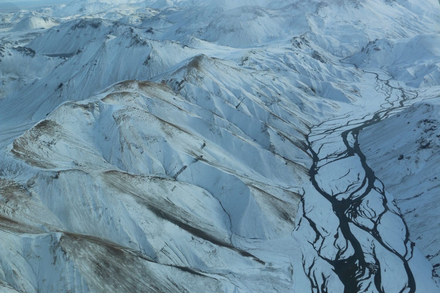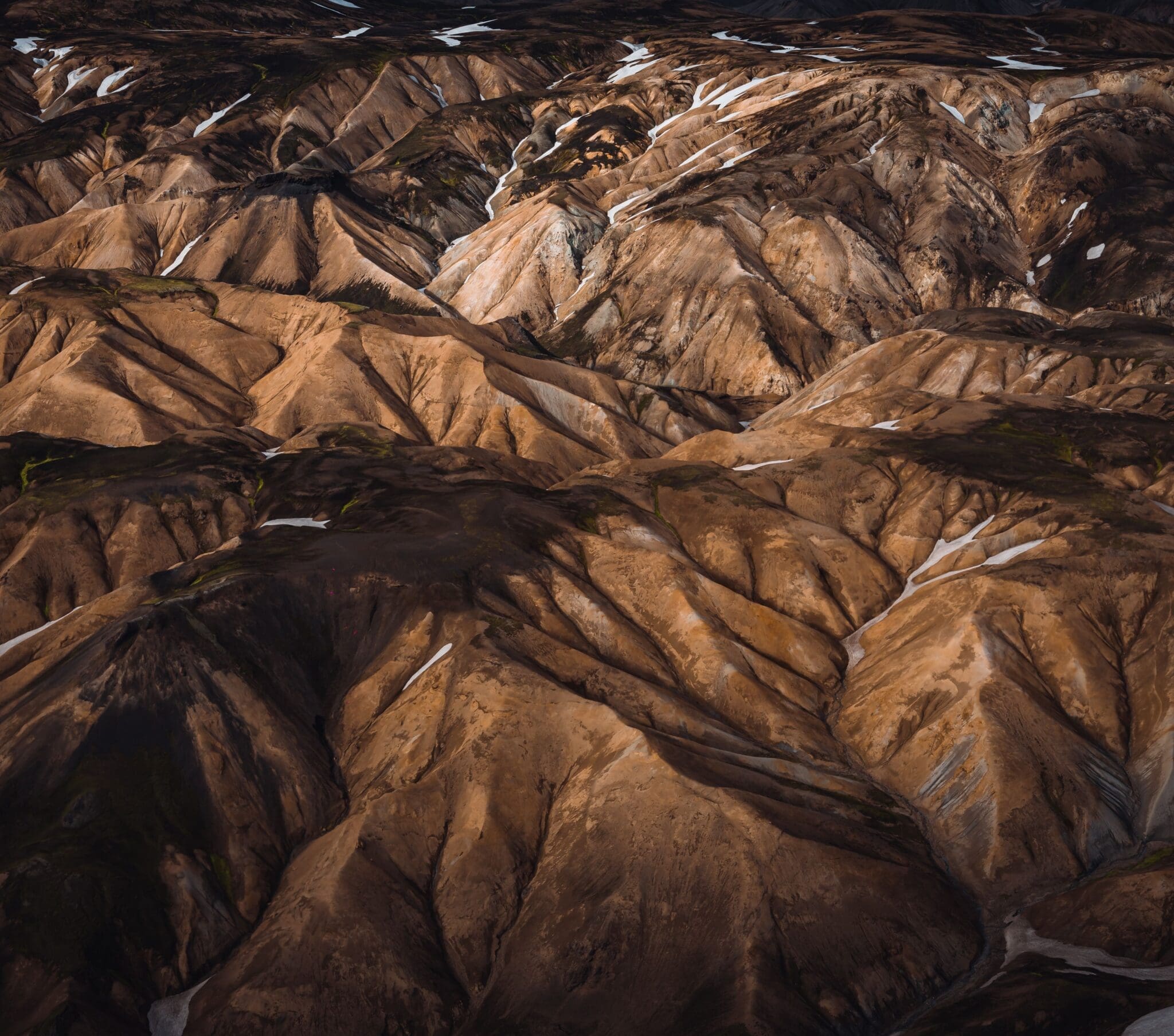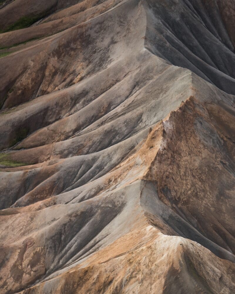 From Lakagígar we fly over to Landmannalaugar, the beautiful valley nestled right alongside the black Laugarhraun lava field, a large field of dried magma that formed in an eruption in 1477. Landmannalaugar is mostly known for its natural geothermal baths like the name suggests, the „people‘s pool“. These natural geothermal baths along with the unique windswept rhyolite mountains, with their various shades of pink, green, blue and golden yellow make this area amazing for snapping some photos from the air.
