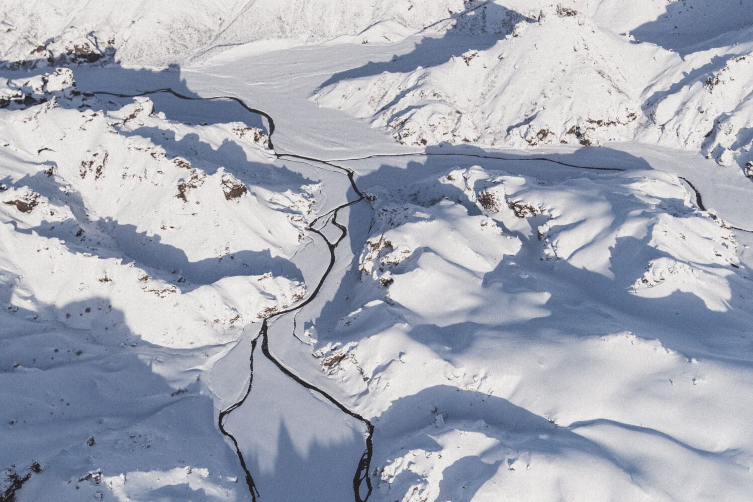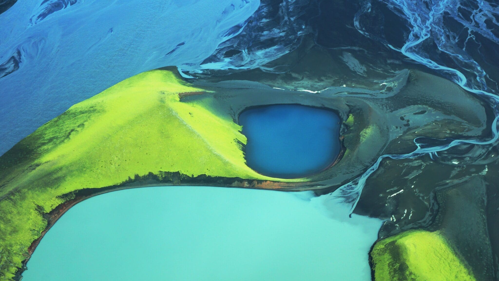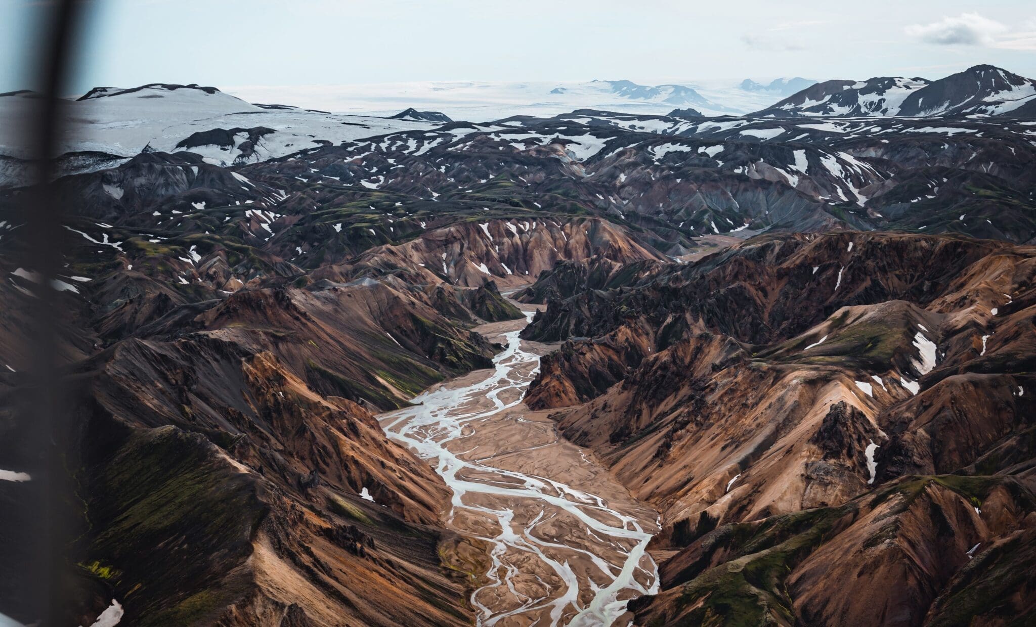 From Lakagígar we fly over to Landmannalaugar, the beautiful valley nestled right alongside the black Laugarhraun lava field, a large field of dried magma that formed in an eruption in 1477. Landmannalaugar is mostly known for its natural geothermal baths like the name suggests, the „people‘s pool“. These natural geothermal baths along with the unique windswept rhyolite mountains, with their various shades of pink, green, blue and golden yellow make this area amazing for snapping some photos from the air.