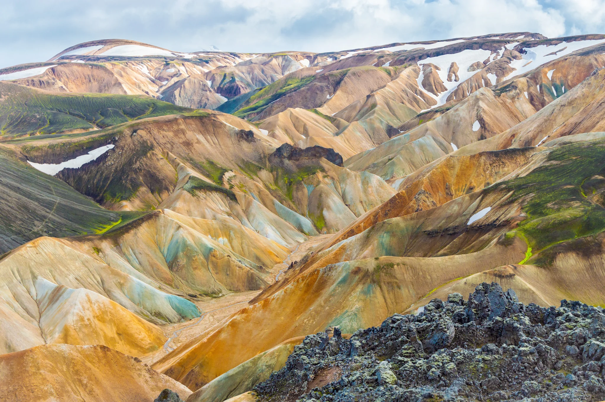 Upon arrival at Landmannalaugar, prepare to be amazed by the stunning scenery. During the summer months, the multicolored rhyolite mountains create a vibrant tapestry of yellow, red, fluorescent green, purple, brown, black, and white. This area is perfect for shorter hikes that provide spectacular views of volcanic deserts, rugged lava fields, inactive explosion craters, and waterfalls.