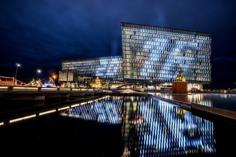 We sail in front of Harpa conference halls light wall and watch as thousands of Icelanders gather infront to watch the countdown into the new year.