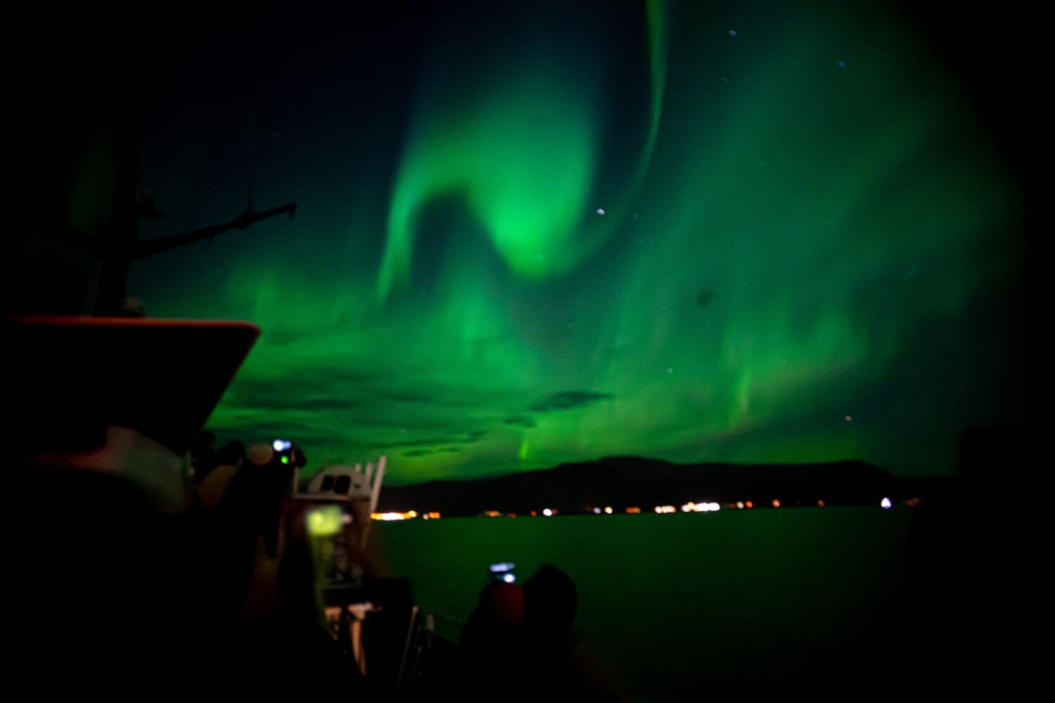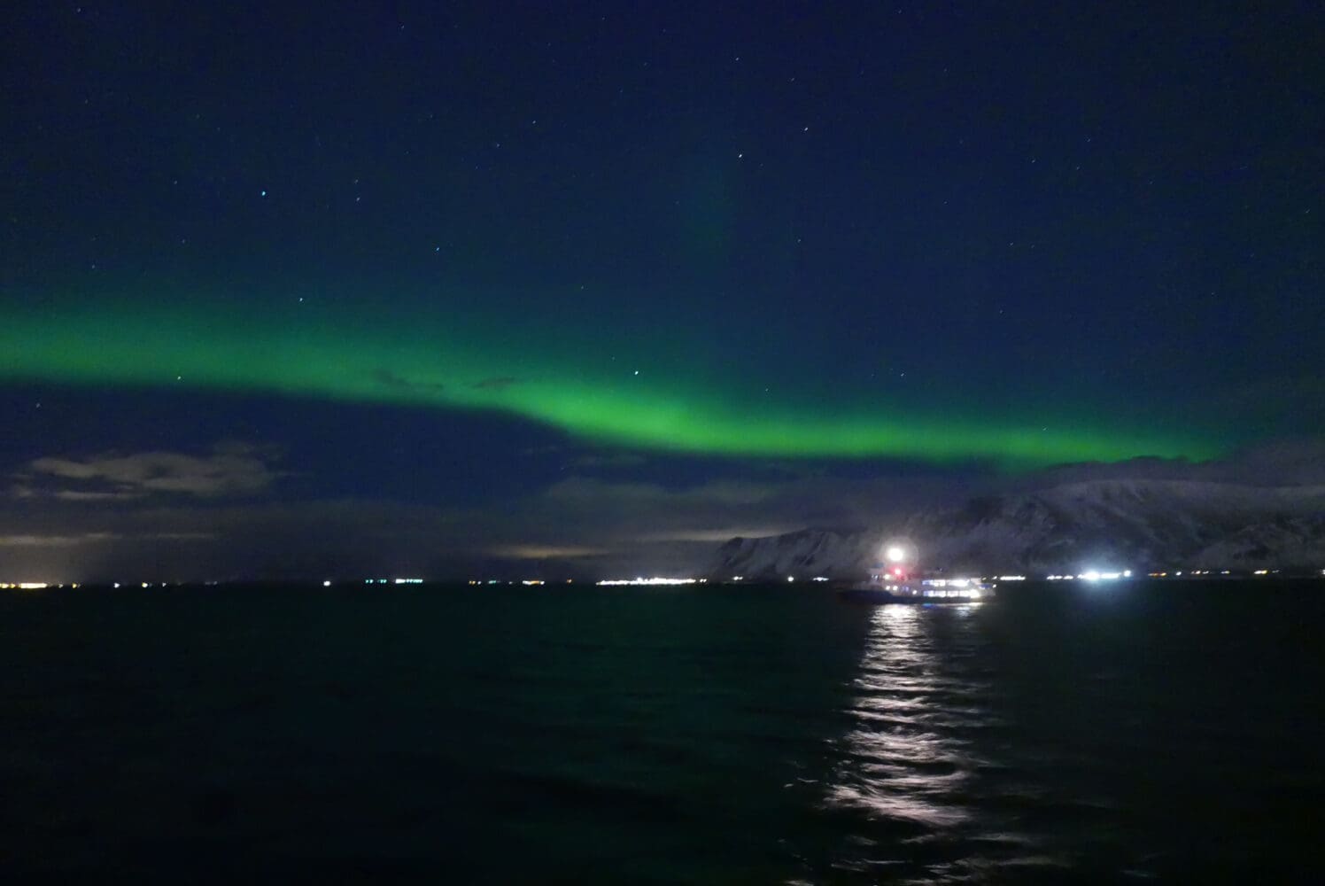 Seeing the Northern Lights at sea is an amazing experience; sailing away from the coastline of Reykjavík and seeing the auroras on the North-Atlantic with the city lights in the background is something you won't forget!