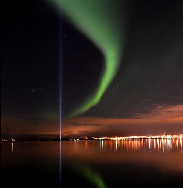 IMAGINE PEACE TOWER is an outdoor work of art conceived by Yoko Ono in memory of John Lennon. It is situated on Viðey Island in Reykjavík, Iceland.