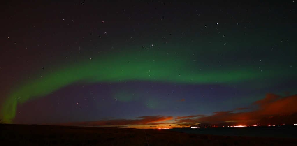 When particles from the sun hit earth’s atmosphere it creates a bright light with colors fluctuating in hues of green to red to sometimes purple.