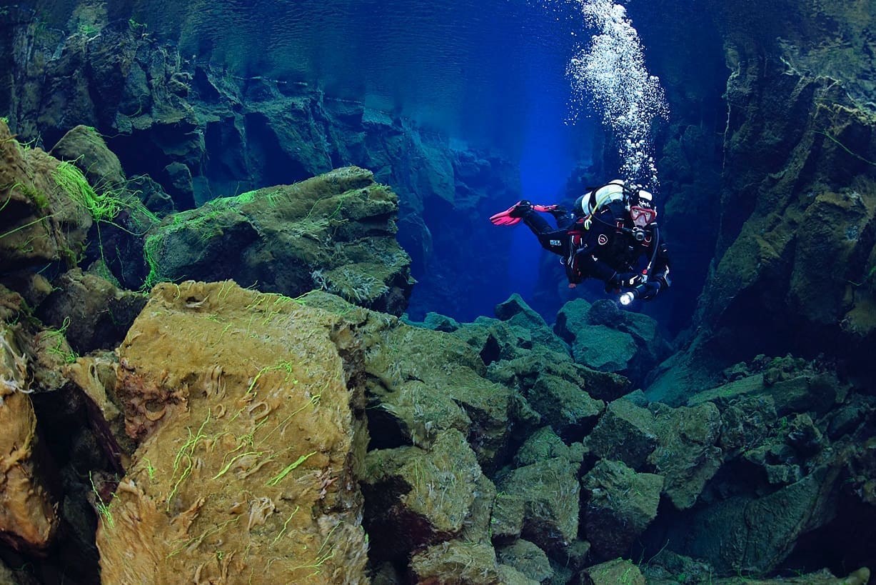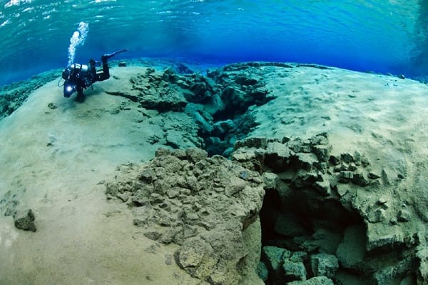 Silfra, a lava fissure filled with crystal clear glacial water, is counted among the top five dive sites in the world by many prominent dive publications. Silfra is best known for its 120 meter underwater visibility and for being the only place in the world where you can dive between two continental plates. On this dive, you will be able to place one hand on the North American continental plate and the other on the Eurasian continental plate. If you are a certified dry suit diver, this is a must-dive site!