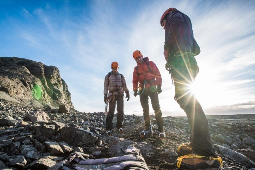 Once you arrive at the glacier parking lot, your guide will begin handing out your gear for the tour. This includes crampons, an ice axe, a harness, a helmet with a headlamp, and hiking boots if you rented them. Once everyone has their gear, you will take a 30-minute hike to the edge of the glacier. The hike is relatively easy for most and will have you walking on flat, yet slightly rocky ground the entire way. We will always go at the pace of our guests so you can take your time and enjoy the walk as your guide leads the way.