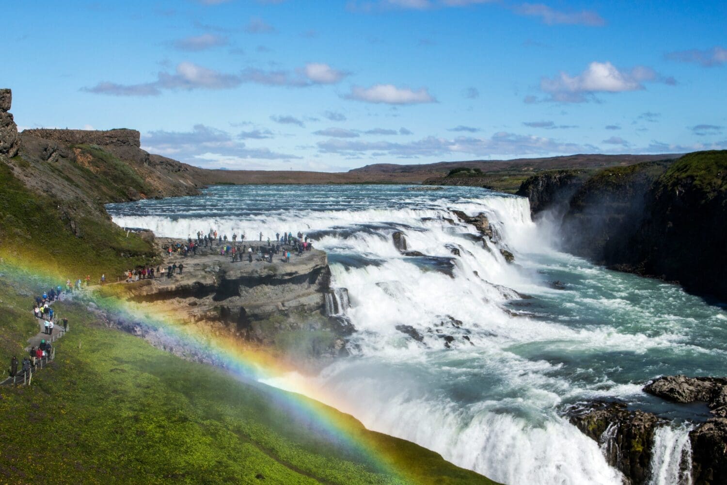 After we leave Thingvellir behind, our next destination will be Haukadalur. This geothermal valley is the home of the geyser which all others of its kind are named after. The Great Geysir does not erupt as often now but its neighbor Strokkur is exceptionally active, shooting boiling water high into the sky every 10 minutes. The surrounding mud pools, hot vents, and fumaroles are sure to pique both your interest and your appetite. We’ll stop for a snack before getting back in the vehicle to visit the jewel the Golden Circle route was named after.