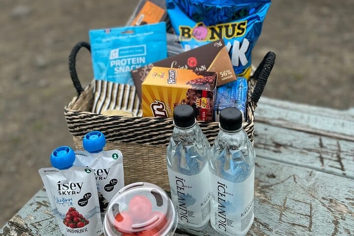 A snack basket with a variety of Icelandic delicacies, fruits and bottled water