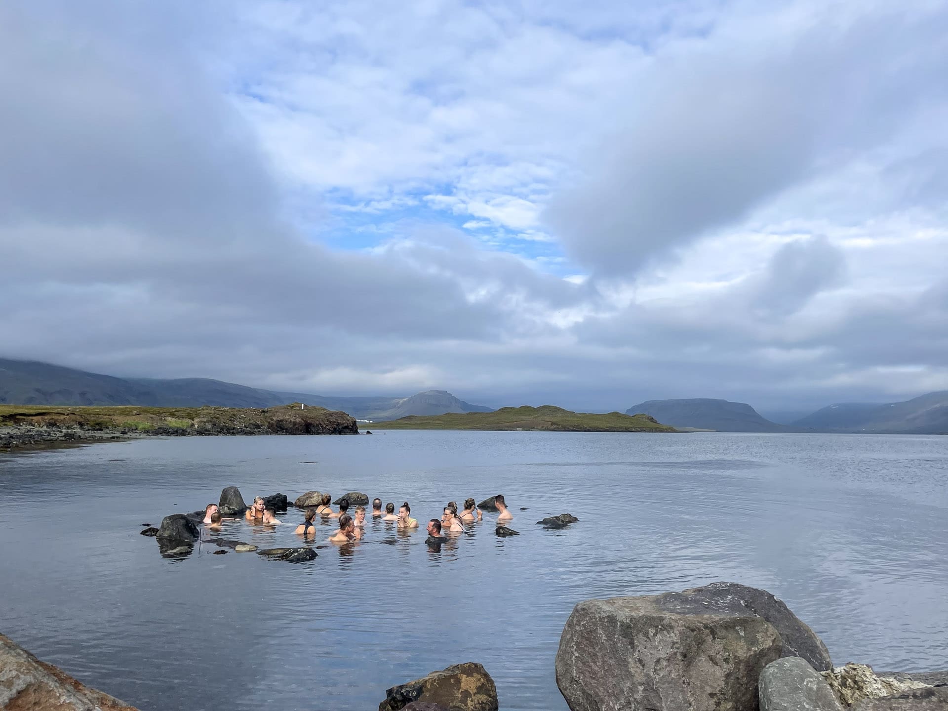 When we have heard enough elf stories, it's time to head to the brilliant Hvammsvik Hot Springs, which is a beautiful experience where you have access to eight natural hot springs that evolve into the ocean with temperatures ranging from ocean temperatures (around 10 °C) to 42°C in the old original hot spring.