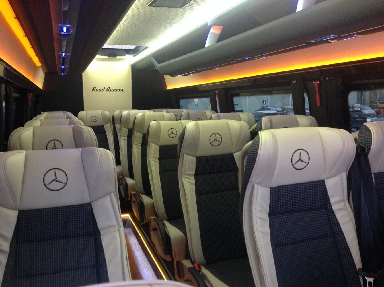 We supply you with a luxury 19+1 seater air-conditioned Mercedes Sprinter minibus with comfortable seats and a friendly driver.