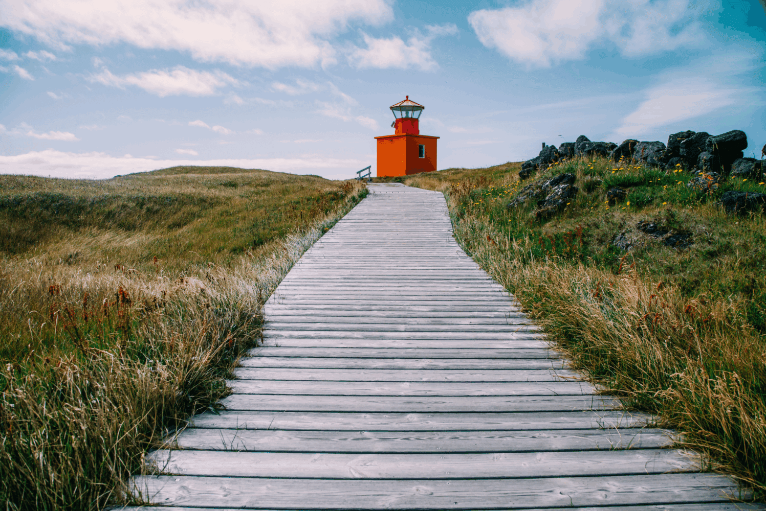 Öndverðarnes cape is the westernmost point of the Snæfellsnes peninsula which used to be an old fishing station from the 13th century into the 20th, with a chapel on-site and a lot of huts for the fishermen. There are a lot of old relics and ruins from ancient times and a deep partly covered stone well called Fálki (e. Falcon – mistakenly called Faxi by some) which can be entered by 18 steps of stone leading down. Fálki used to be the only waterhole in the area it was believed to contain three sources of water; one with freshwater, another with mineral water, and the third with saltwater. The small and orange-colored Öndverðarnesviti standing 5 m (16 ft) tall, was built in 1973 but before was another lighthouse built in 1909 which was the first lighthouse on the Snæfellsnes peninsula.