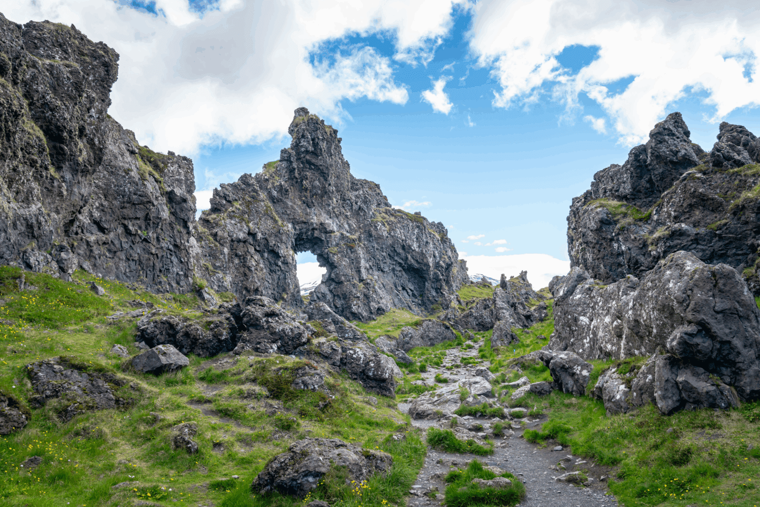 A walking trail runs from the statue of Bárður along the coastline where you will see many of the amazing formations aforementioned; lava and basalt cliffs, vaults, and ravines eroded by waves for centuries. From the first observation platform, you will see basaltic caves beneath and a beautiful view over the Atlantic Ocean. Going onto the next platform gives you a great view of Gatklettur, a rock arch with a big hole in it, extending from the basaltic cliffs. Walking further you will reach the first of three ravines, which are like holes in the ground by the coastline. It’s tempting to have a look down these ravines at the sea coming in, but please watch your steps and be careful so as not to fall into them. These ravines are collectively named Stapagjár (e. Ravines of Stapi) but individually they are called Norðurgjá (e. The North Ravine), Miðgjá (e. The Middle Ravine), and Músagjá (e. The Mousy Ravine). On days when the weather is bad and waves are strong, you may see the surf splashing up into the air from these ravines. The stone bridges by these ravines attract people to walk over for great photo opportunities but keep in mind they could collapse at some point. Next to one of these ravines is Arnarstapaviti, a white square lighthouse 3 m (9.8 ft) tall. Standing next to the Snæfellsjökull glacier, hovering over Arnarstapi, is the peculiar 526 m (1,725 ft) high Stapafell which is a palagonite volcano. From some angles, it looks like it’s shaped like a pyramid.