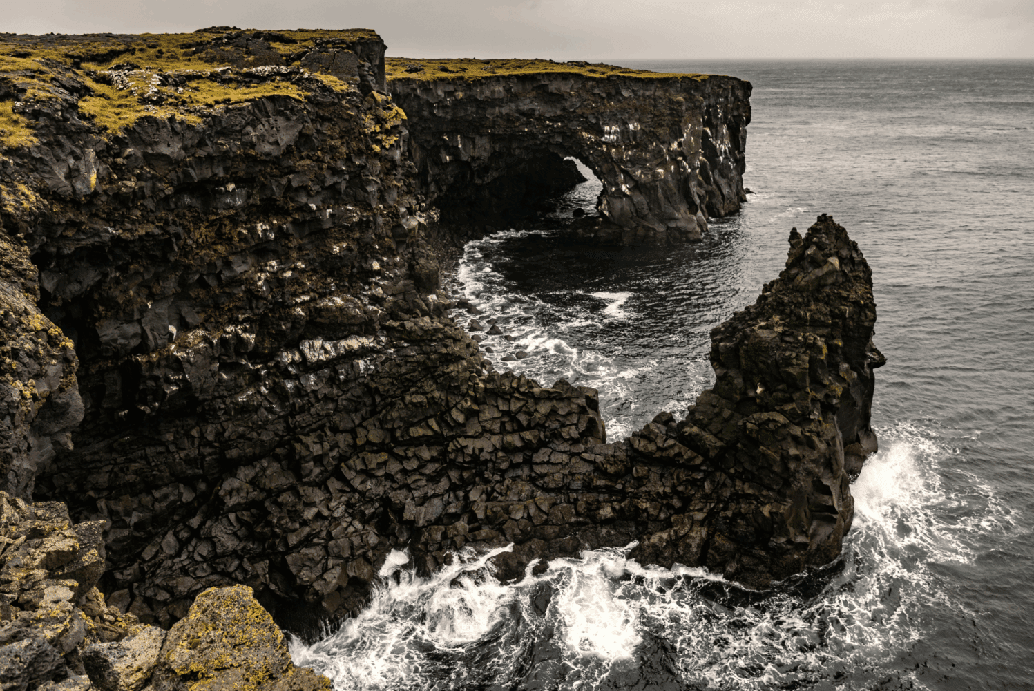 Next are the twin villages of Hellnar and Arnarstapi. Hellnar was a large old fishing station dating back to 1560 but now only a few people live there. A cozy little café by the beach Hellnafjara is popular for the great views it offers from its patio and down by the beach is the remarkable cave Baðstofa inside the protruding boulder Valasnös. Its magical uniqueness lies in the coloration inside formed by the tides and different lightning hitting the scales of rocks inside. Arnarstapi is a small fishing village with strange rock formations along its coastline and cliffs filled with nesting sea birds. First, you're greeted by the huge statue of Bárður Snæfellsás, the aforementioned protector of Snæfellsnes. Then a walking trail takes you along the coastline for admiring various lava and basalt formations. The rock arch Gatklettur extends from the cliffs with a big hole through, and further along, are three holes in the ground with the ocean coming in and basalt cliffed walls with sea birds nesting on some days the strong ocean waves splash up into the air from these ravines. Nearing the end of this tour, we drive through farmlands by lava fields, and one of these farms was the home of a notorious killer. Axlar-Björn was the first serial killer in Iceland AND is still the only one. He lived on the farm Öxl in the 16th century, where he would kill travelers passing by with an axe. Hiding their bodies in the cowshed, killed 9 people and kept their belongings until one traveler managed to escape. That led to the arrest of Björn who was sentenced to death. Before he was beheaded, his limbs were crushed with a sledgehammer and his body was cut down and put up on poles, and then his body parts were dug in three graves, to prevent him from returning to haunt the living, with cairns on top. One of these cairns still stands in a lava field by Hellnar and is declared protected. After we've passed Öxl we turn to the very small village of Búðir by the edge of the pitch-black Búðahraun lava field. One of the most photographed churches in Iceland is the black wooden Búðakirkja church with its white window and door frames and a stonewall around its graveyard. It's a replica of the former church and the only reminder left of this former vibrant fishing village. Further down is a green-yellowish beach of olivine sand, which is very rare in the world. We make our way to our last stop which is the golden sand beach Ytri-Tunga. It has a large seal colony and is very popular for seal watching, especially over summer. Two seal species, the harbor seal and the grey seal reside here peacefully in harmony. Seals used to be vital for the survival of Icelanders, but now it is prohibited to hunt these beautiful creatures in Icelandic territory.