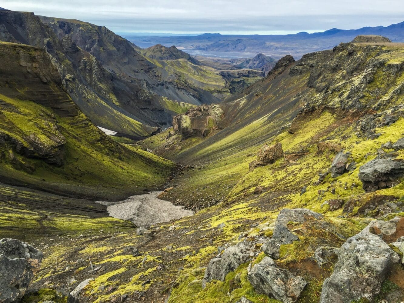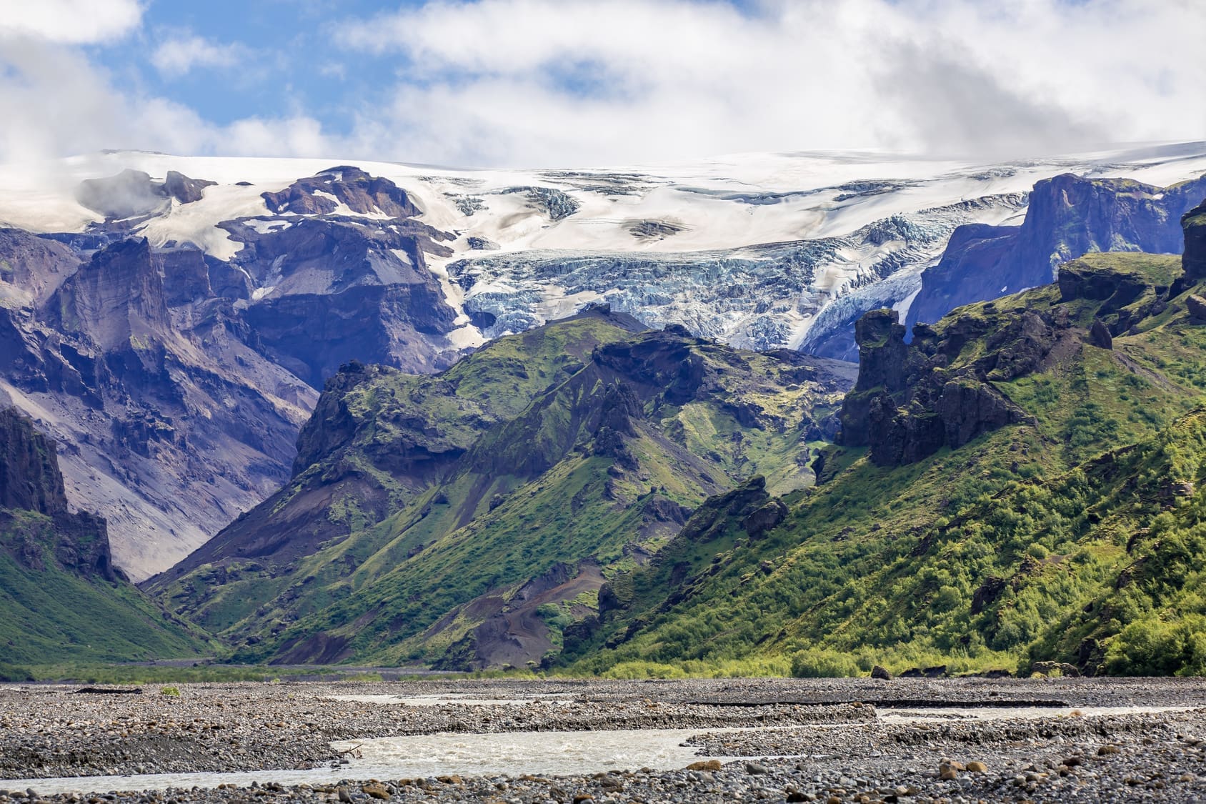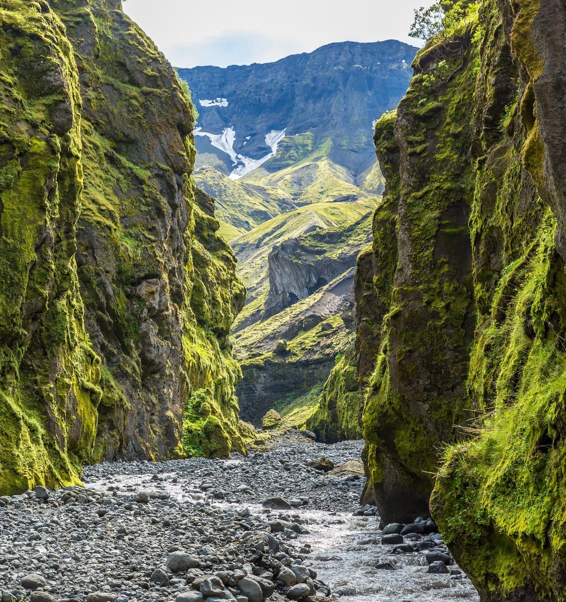 Þórsmörk offers popular hiking trails and accommodation options like the Volcano Huts. After a day of hiking or super-truck-cruising through the Lord-of-the-Rings-like Þórsmörk, you can relax and await the appearance of the Northern Lights in the night sky above the glaciers. Alternatively, depending on the time of year, you can bask in the magnificence of this microcosmos illuminated by the midnight sun.