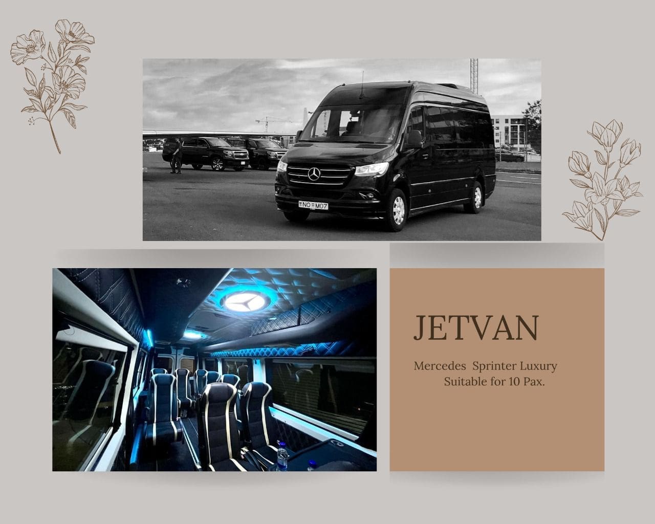 • Your chauffeur will meet and greet you with your private chauffeur driven Mercedes Sprinter 10 seater at the Airport. He´ll be displaying a greeting card with your name directly after you come through customs at the airport.