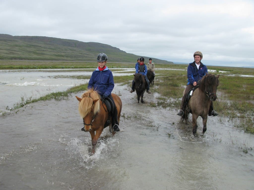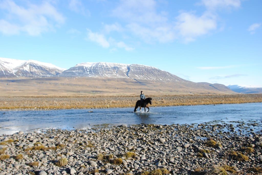 This trip begins with a highlight: after a short ride on countryside tracks, we will arrive at the amazing waterfall "Reykjafoss". You will soon understand why Icelanders describe it as "the steaming falls"! Later on, you will be having fun crossing quite a few rivers on your trusted companion, the Icelandic horse. In the amazing natural paradise of the river delta Héraðsvötn you might, depending on the season, be able to watch birds hatching or pick a handful of crowberries whilst taking a short break. The terrain offers the best possibilities to fully experience the gaits of the Icelandic horse, especially the famous tölt.