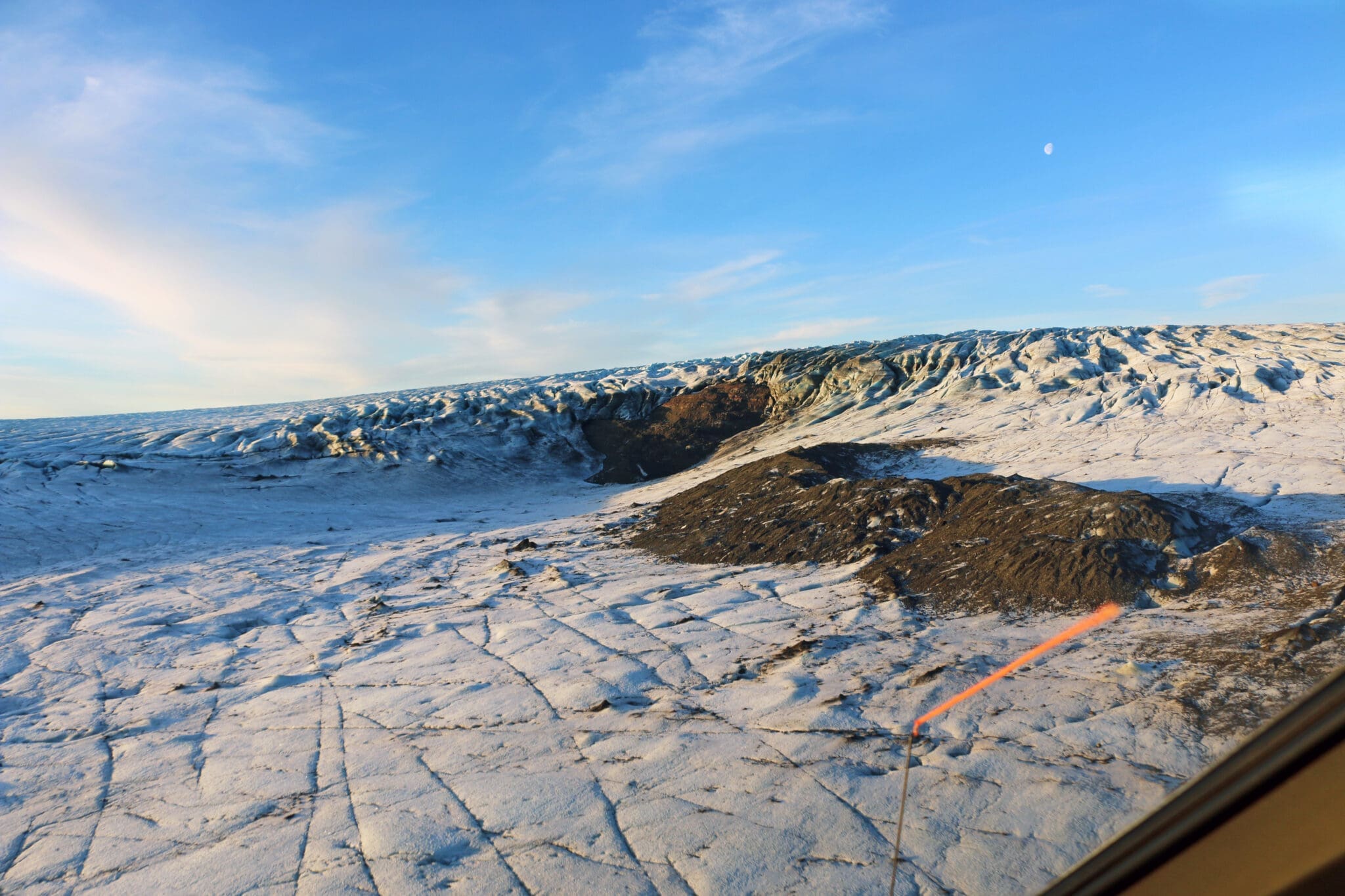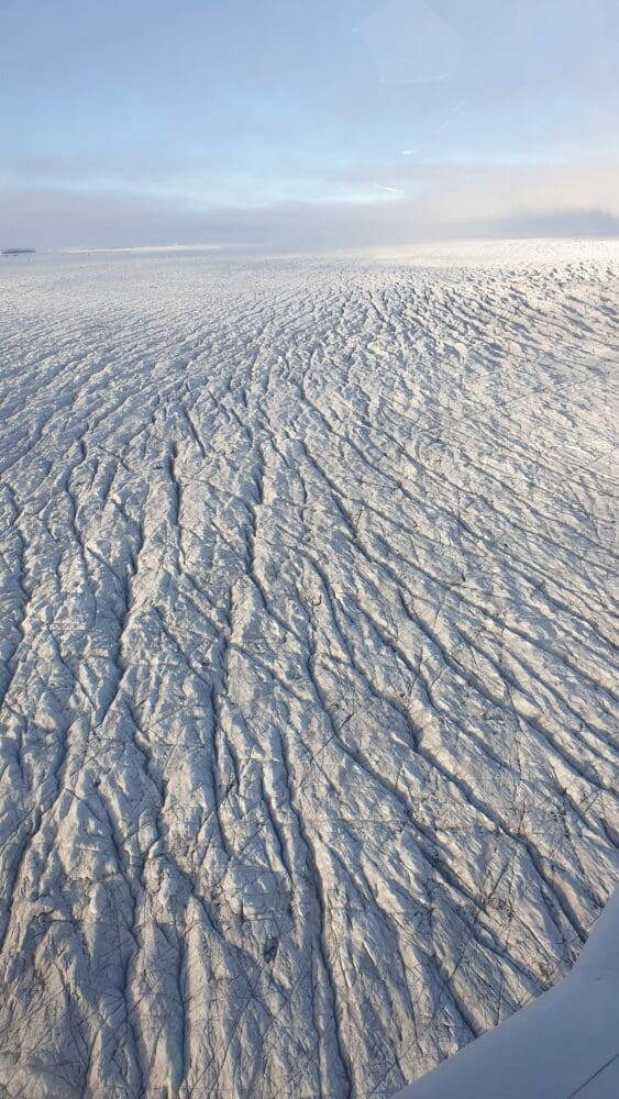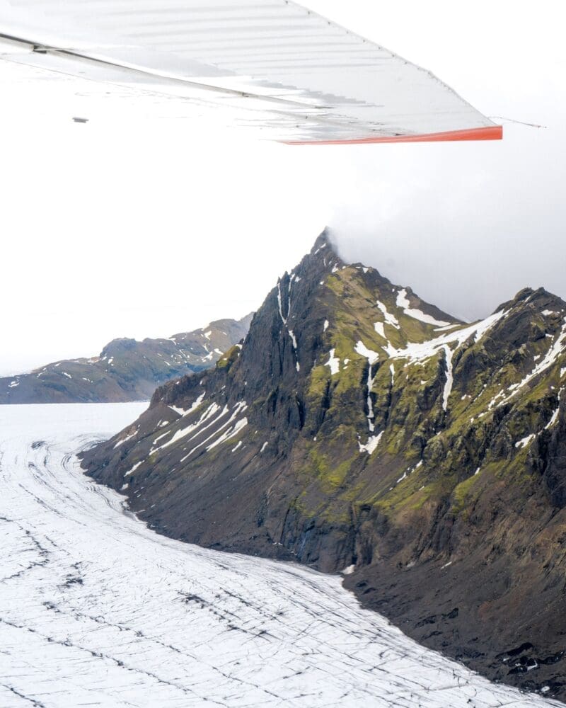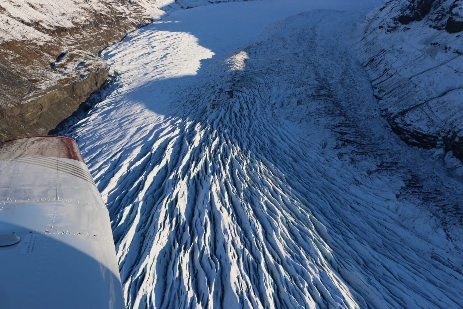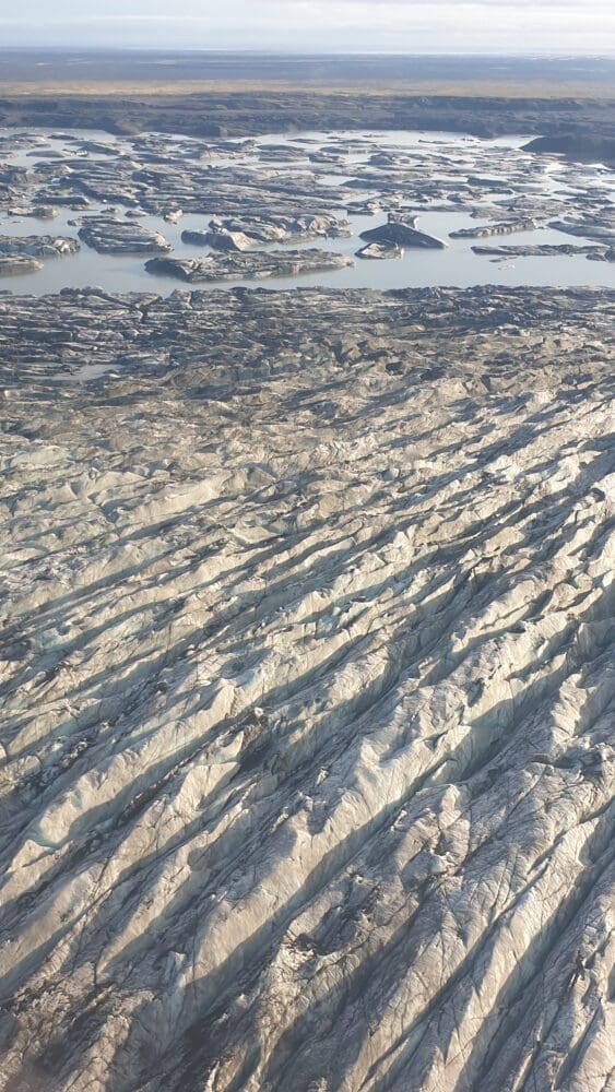 - Fly over Vatnajökull’s outlet glaciers, with their icy ridges spilling into the valley below.