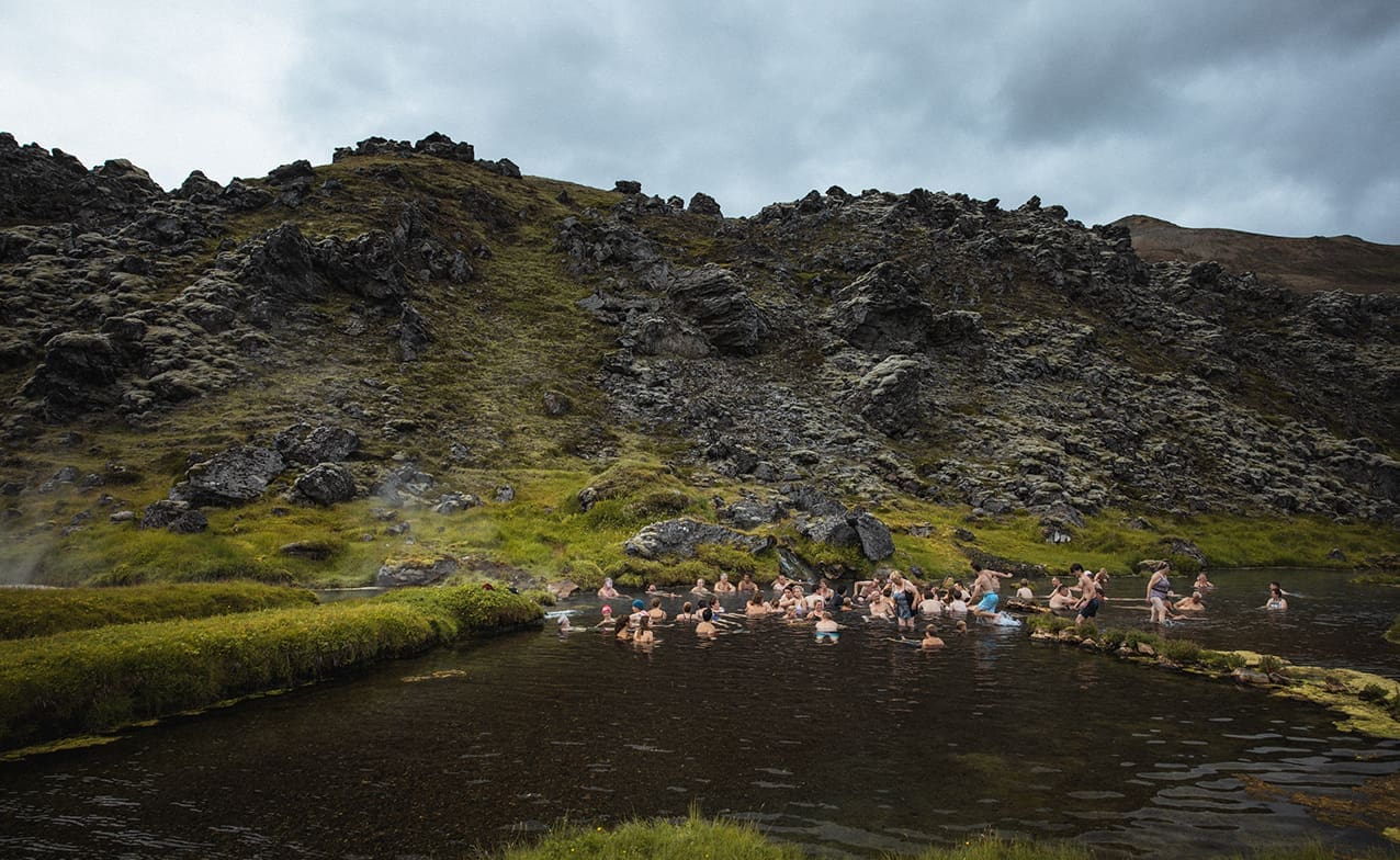Reaching the mountains we’ll pass by two volcanic craters, Bláhylur, Ljótipollur, filled with gorgeous blue water. Another picture perfect opportunity alert! Last but not least, time for our ultimate destination, the magnificent Landmannalaugar. Apart from epic hikes along the trails surrounded by rainbow-colored mountains, 'People's Pools' offer a geothermal oasis with hot springs. To jump into and recharge batteries before the ride back… sounds like a perfect plan!