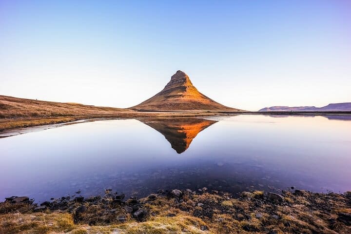 Start the day by visiting the wonders of the Snæfellsnes Peninsula, which has so much to offer you! On the road, you see the stunning Sugandisey Cliff at Stykkishólmur and Saxhóll, an extinct volcanic crater. The iconic mountain Kirkjufell and the nearby waterfall are the most recognized landmark of West Iceland. Next, you can optionally explore the Vatnshellir Cave formed around 8,000 years ago; if you select this activity to be added to your tour when making the booking.