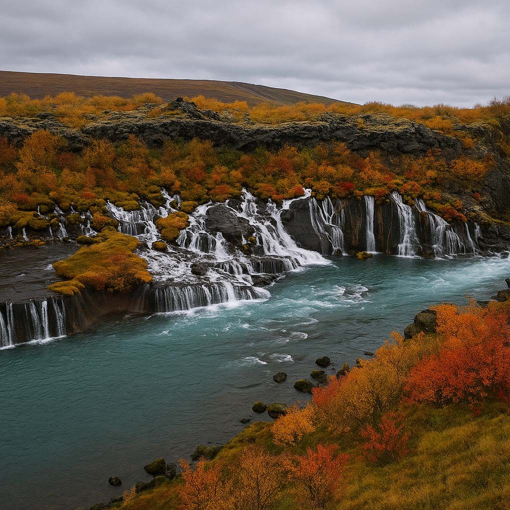 Hraunfossar & Barnafoss Waterfalls: Prepare to be enchanted by these truly unique waterfalls! Hraunfossar (Lava Falls) is a stunning series of countless small cascades that appear to emerge directly from beneath a vast lava field, trickling into the Hvítá River in a mesmerizing display. Just a short walk away, you'll find Barnafoss (Children's Falls), a powerful and dramatic canyon waterfall tied to intriguing Icelandic legends.
