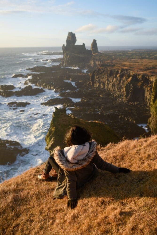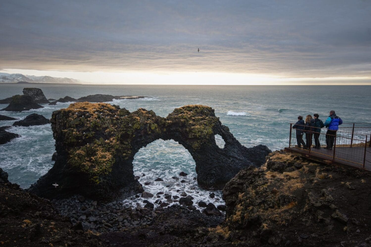 Just 15 minutes from the Black Church, you will come to your next stop, Arnarstapi Village. This quaint fishing village is situated on the edge of a steep cliff overlooking the ocean and boasts a stunning coastline of basalt formations and dramatic sea stacks. After exploring the beautiful houses and harbor of the village, you will be able to take a leisurely walk along the cliffs to Gatklettur Arch, a natural arch formation that has been carved out of the surrounding cliffs by the crashing waves from the Atlantic Ocean over thousands of years. From there, you can walk further down the rugged coastline and discover a natural land bridge known as Midgja which goes over a small basaltic cove. Stay away if you are afraid of heights!