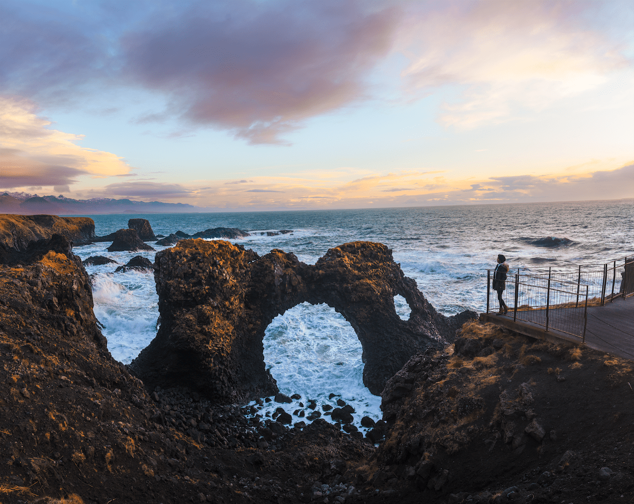 Stops will include Iceland’s famous Black Church as well as the fishing village of Arnarstapi which is known for its dramatic basaltic coastline. Lóndrangar, also known as the castle rock, will showcase this even more being a sea stack that formed from volcanic activity over thousands of years. You will visit the massive Svöðufoss waterfall which runs down from the top of one of Iceland’s most famous volcanos- Snaefellsjokull. To end your day, you will visit Iceland’s most iconic mountain, Kirkjufell, where you will get to experience a magical double waterfall, a perfectly symmetrical conical mountain, and the perfect spot for some beautiful photos.