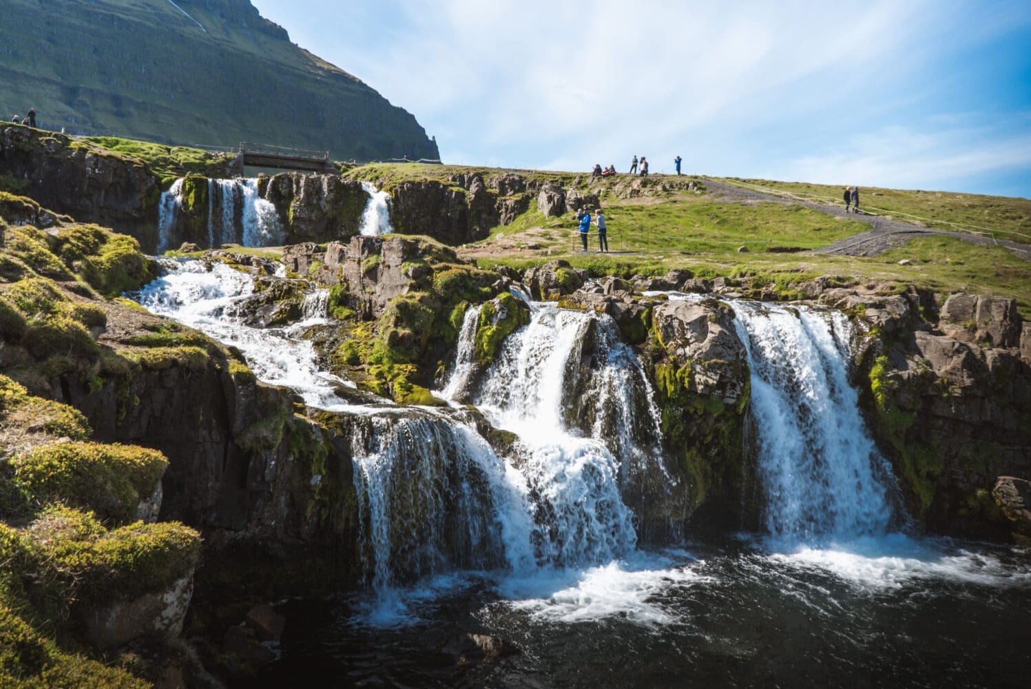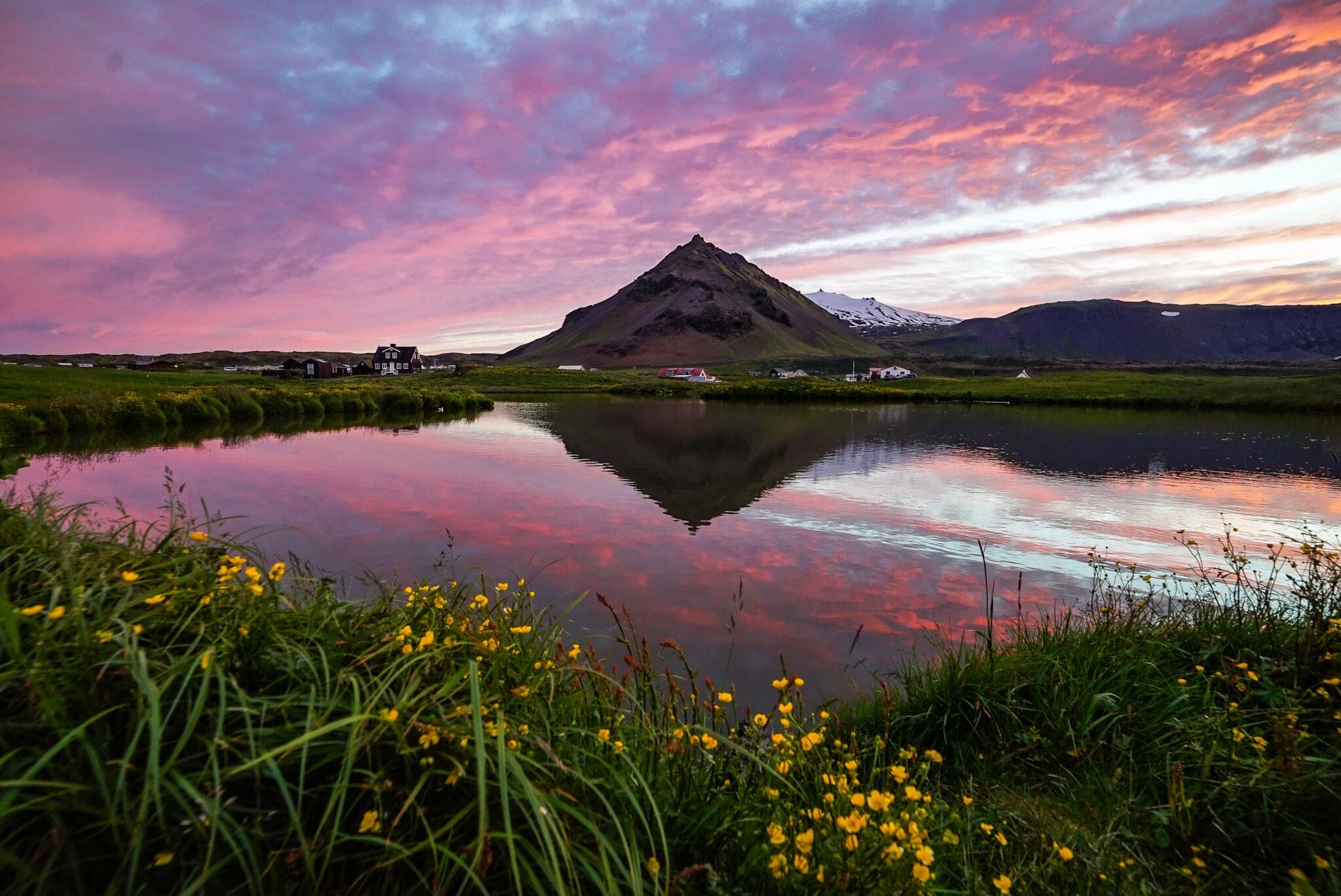 Located on the northern side of the Snæfellsnes Peninsula, the first attraction of the day is the "arrowhead" mountain – Kirkjufell. The mountain protrudes from the ocean at 463 meters (1,519 feet) and towers over a fishing village below. With its unique shape and reflective effect in the water below, Kirkjufell is extremely popular with photographers. You won't want to forget your camera for this stop – not to mention the mountain is surrounded by some epic waterfalls.