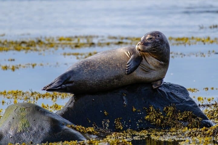 Unlike many of Iceland’s dramatic black sand shores, Ytri Tunga stands out with its lighter, warm‑hued sand, rocky shorelines, gentle dunes, and views out over the Atlantic. Its biggest draw is the seal colony. Both harbour (common) seals and grey seals frequent the area, sunbathing on the rocks or swimming close to the shore, especially at low tide in summer.