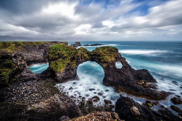 Join a full-day guided tour of the spectacular Snæfellsnes Peninsula in West Iceland. Start your journey at Ytri Tunga, a golden beach known for seal sightings, before exploring the scenic coastal cliffs of Arnarstapi. Continue to Djúpalónssandur, a black pebble beach with fascinating shipwreck remains and historic lifting stones once used by local fishermen.