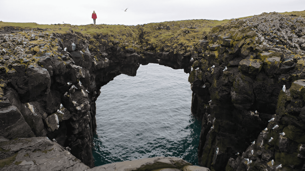 We’ll visit the charming village of Arnarstapi, a picturesque place with mountains behind it and cliffs by the sea. It used to be a busy fishing village, and you can still feel its history. Enjoy a walk along the cliffs and maybe spot some seabirds. The Arnarstapi bridge is a famous photo spot.