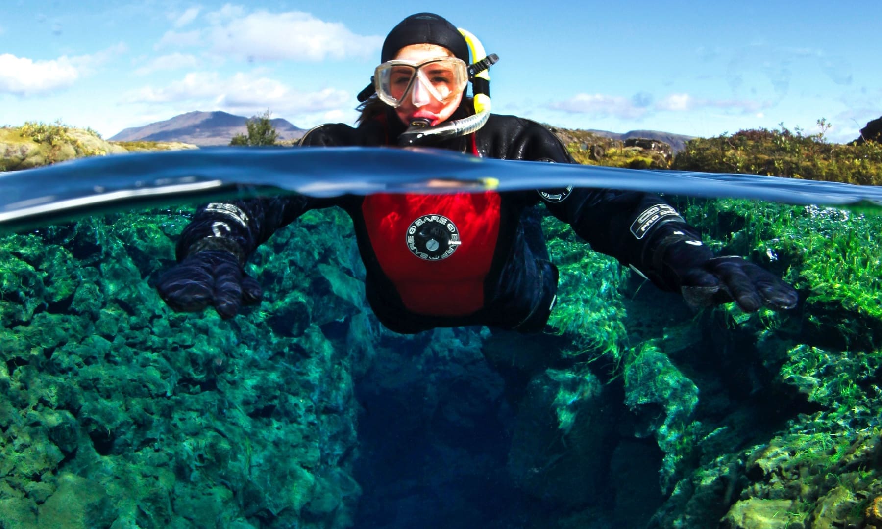 During the summer months in Iceland when the sun only briefly dips below the horizon, diving in the bright night in Silfra is an especially magical experience. Thingvellir Park is particularly quiet and serene at this time and the low sun creates a beautiful, calm atmosphere.