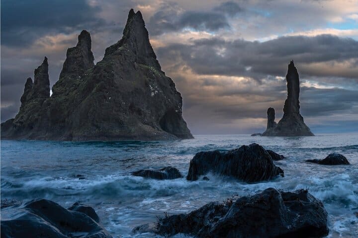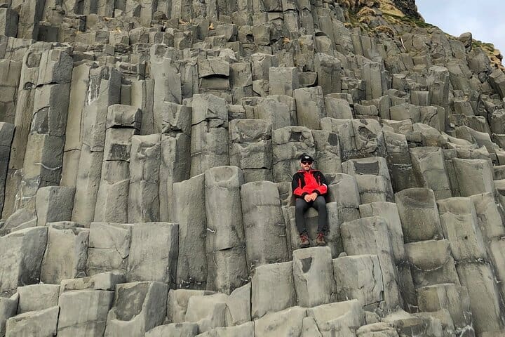 After that, we'll head to the Black Sand Beach, where you can walk on the black volcanic sand and admire its basalt columns, caves, and Reynisdrangar, that are basalt sea stacks that rise from the ocean just off the shore.