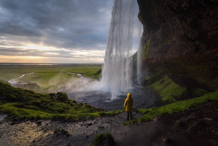 The first stop on our tour is the breathtaking Seljalandsfoss waterfall. During most of the year, you can walk behind the waterfall into a cave for a view from the back and the sides. The surrounding area is also home to a variety of plant life, including moss, wildflowers, and ferns that add to its majesty. Bring a rain jacket because this waterfall by far has the most spray!
