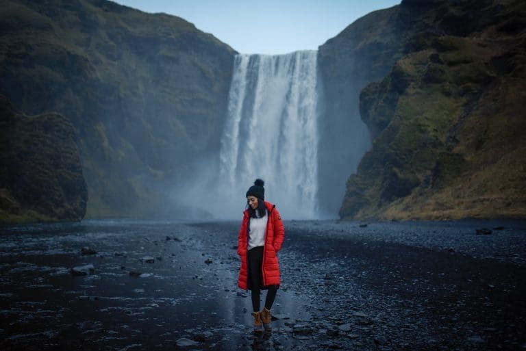 Next up is the mighty Skogafoss waterfall, one of Iceland’s largest waterfalls, with a drop of over 60 meters. Feel the power of this waterfall close up. The mist from the falls can create a beautiful display of rainbows on sunny days if you’re lucky. If you want a workout, climb up a nearby staircase to get a birds-eye view of the waterfall and surrounding landscapes.