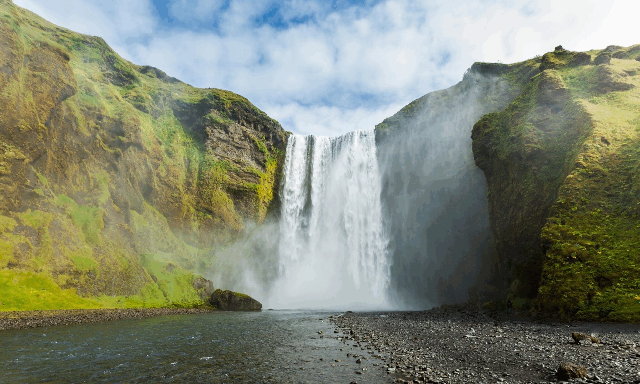 Continue to Skógafoss, a 60-meter curtain of whitewater framed by wide plains and green mountains. Its mist often forms vivid rainbows, making it a favourite for photographers. View it from the base or climb the nearby staircase for sweeping panoramas, either way, Skógafoss is cinematic and unforgettable.