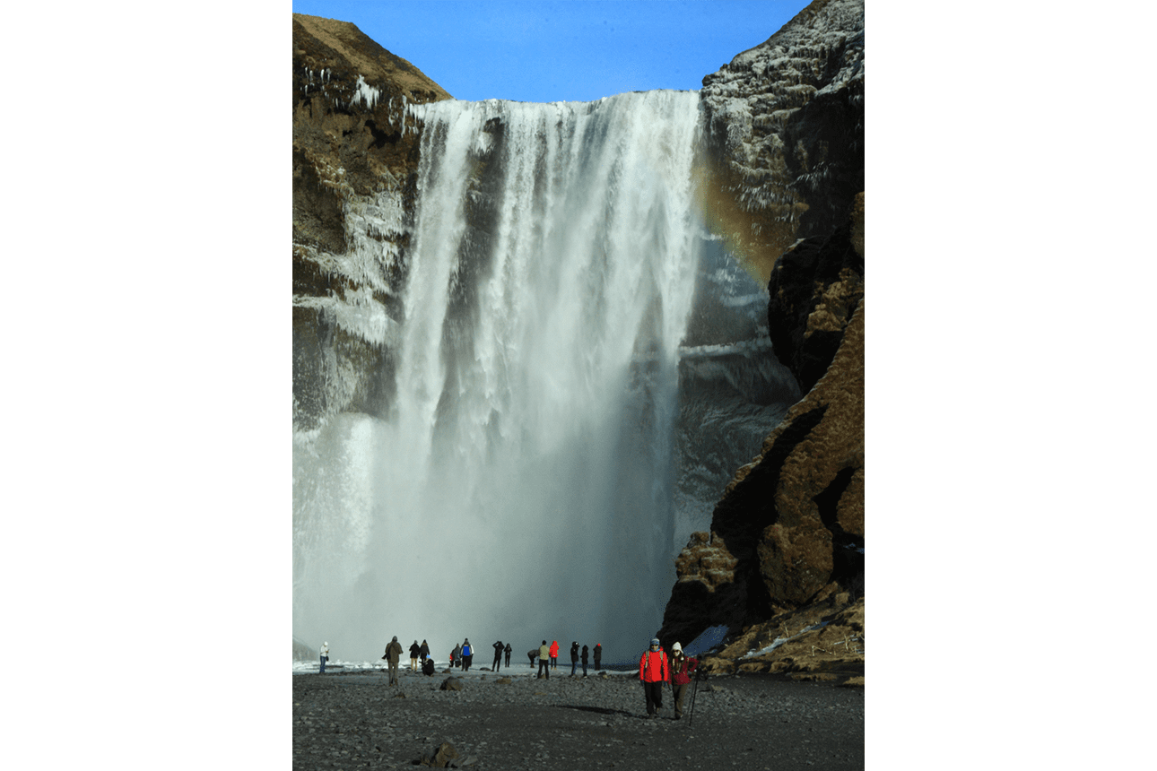 One of the most popular waterfalls in Iceland and one of the 5 largest in the country. An iconic symbol with a width of 25m and a drop of 60m. Getting so close to the base of such a large waterfall is a quite rare experience. You can also enjoy it from above : there are stairs that lead to the top. The view from there is stunning. On sunny days, you can see a single or a double rainbows which are formed with the powerful water splashing.