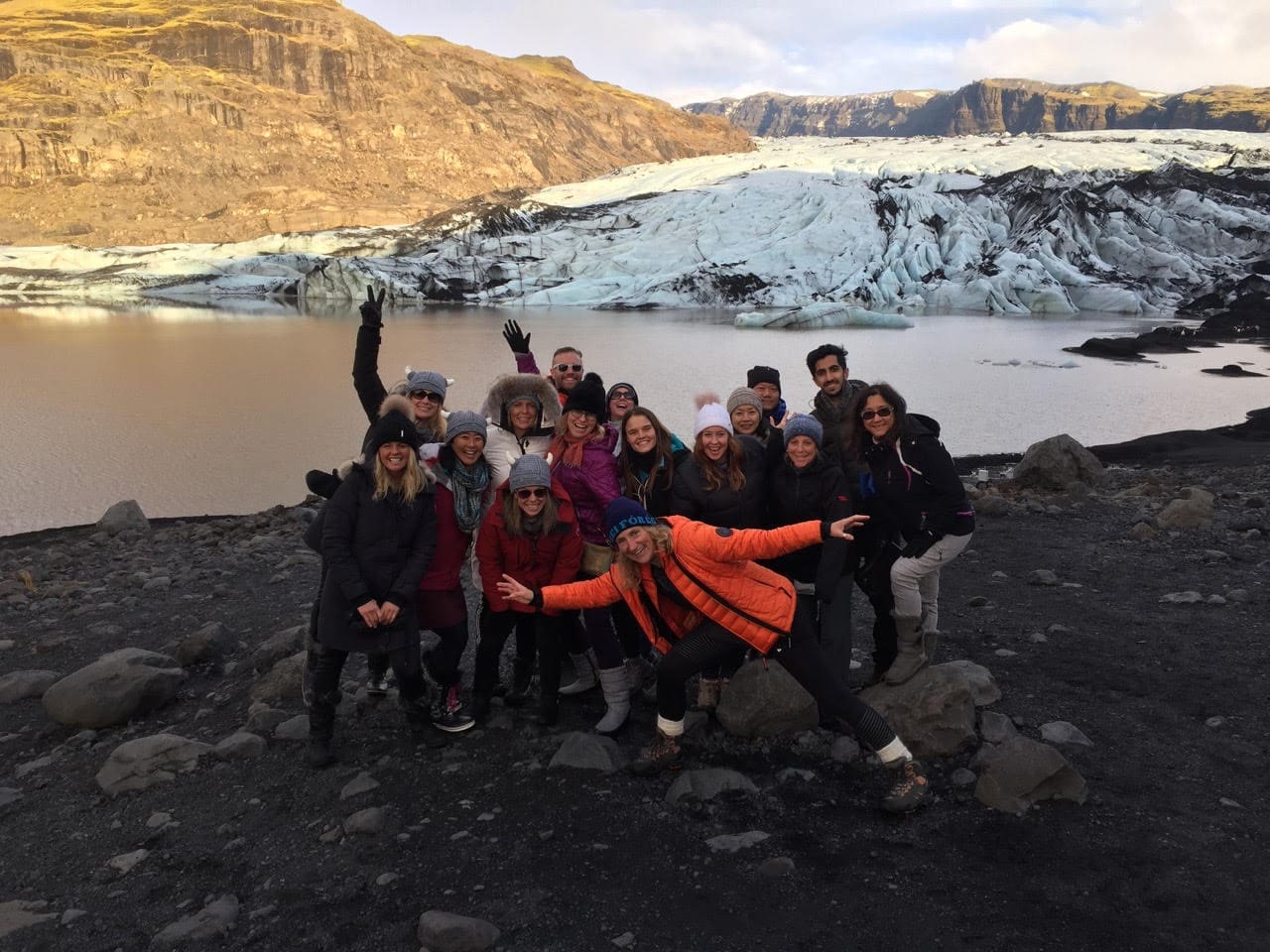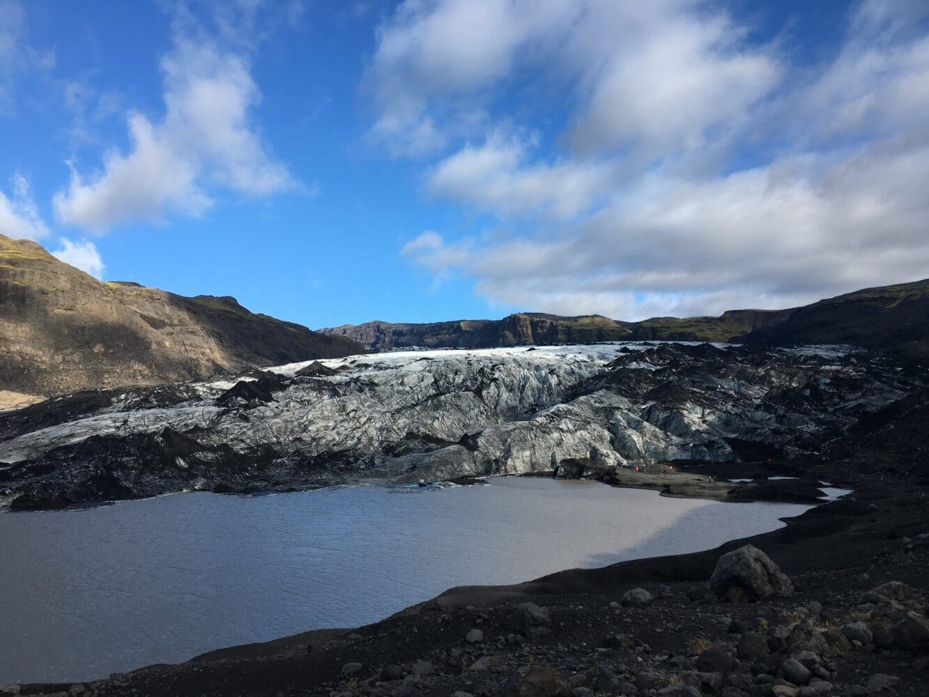 We do have many glaciers in Iceland, especially on the south coast of the island. The one we stop at is called Sólheimajökull and is located between two our most famous volcanoes, Eyjafjallajökull and Katla. The glacier is part of a bigger one called Mýrdalsjökull and is fairly accessible.