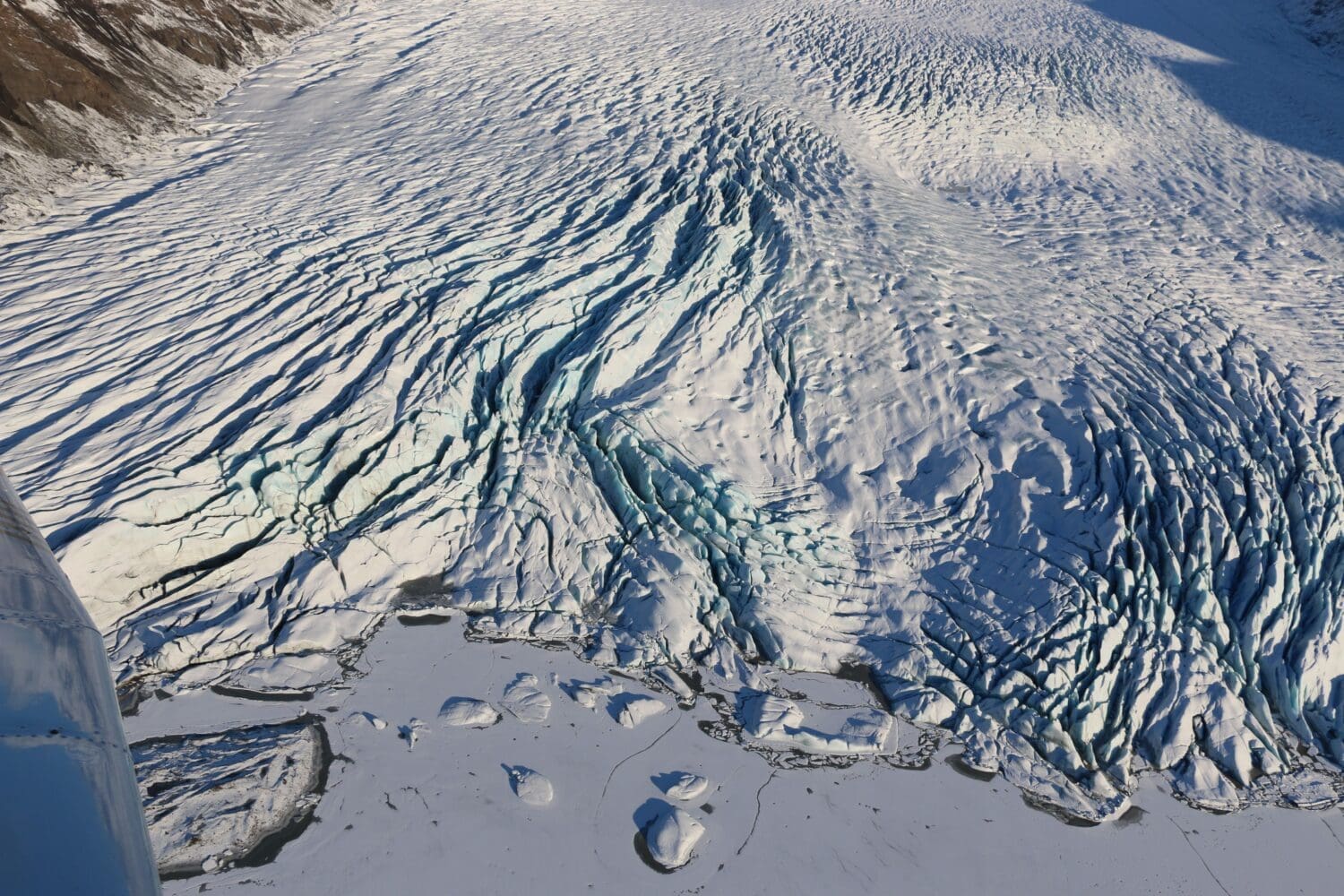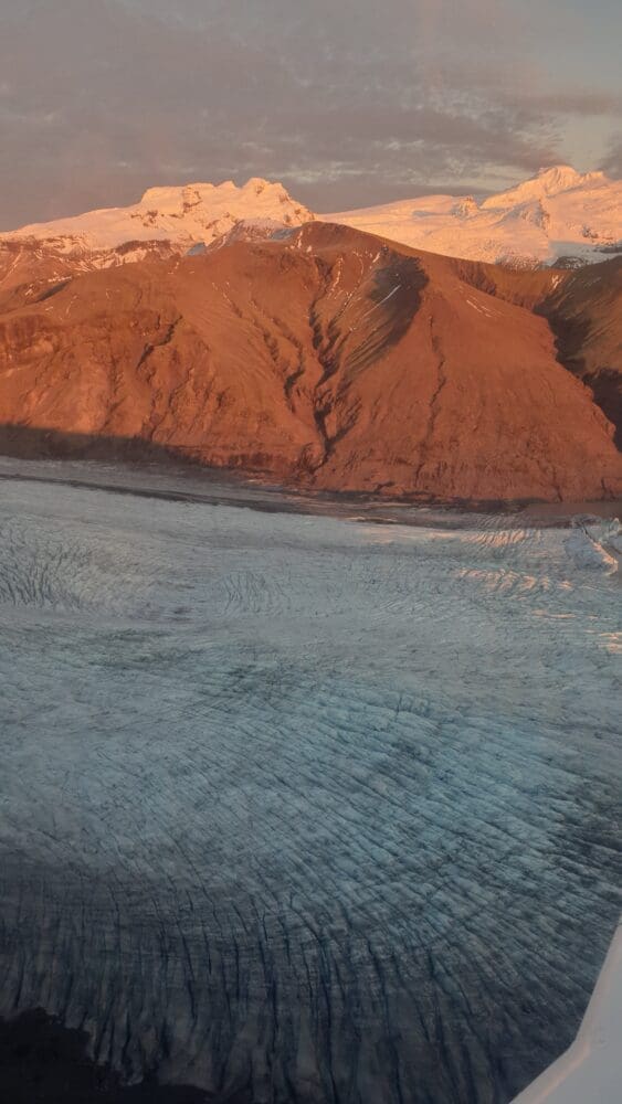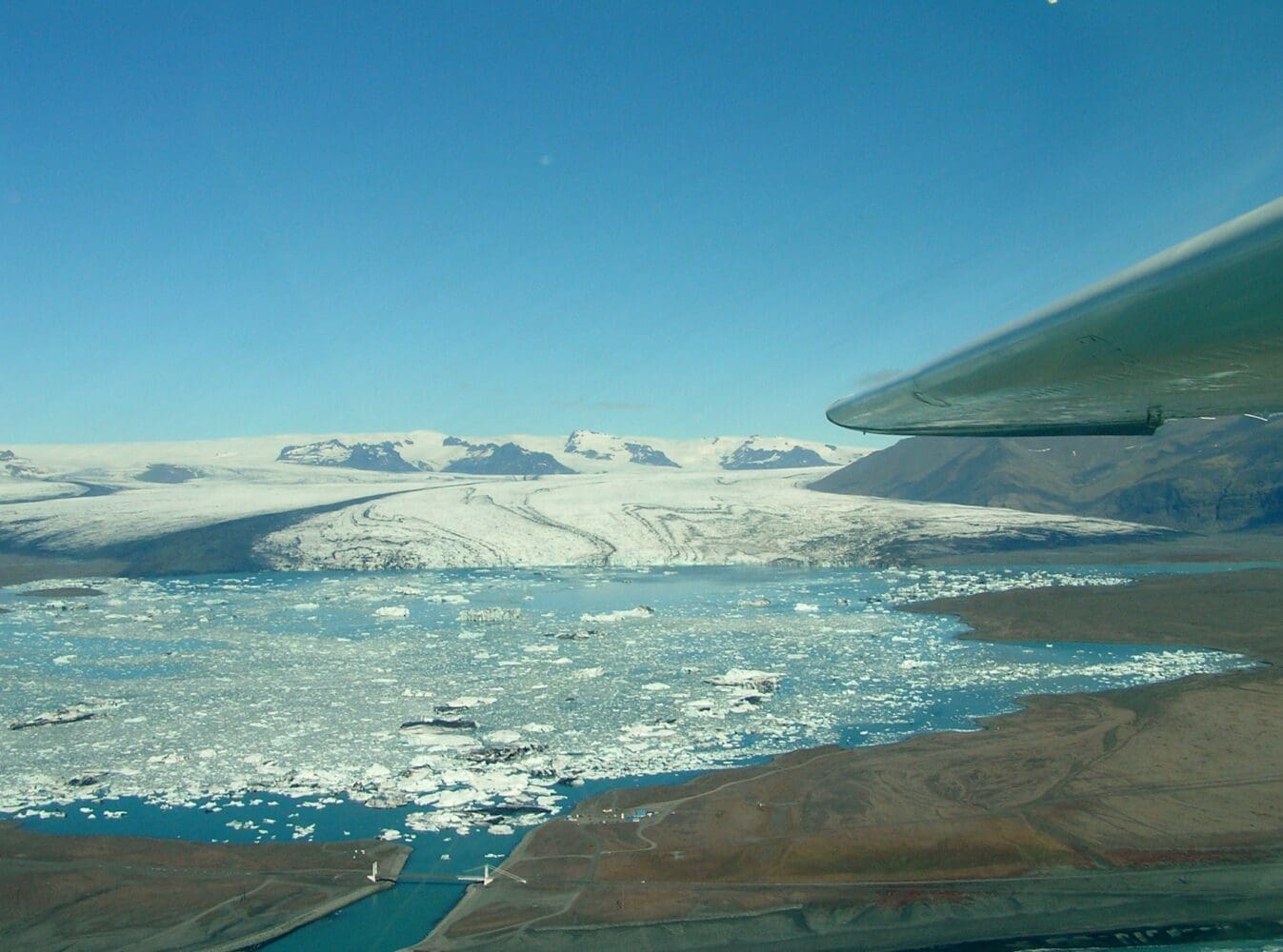 - Fly across Vatnajökull Glacier and several outlet glaciers, their crevassed ice stretching far into the lowlands.