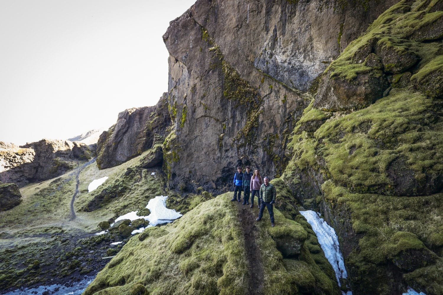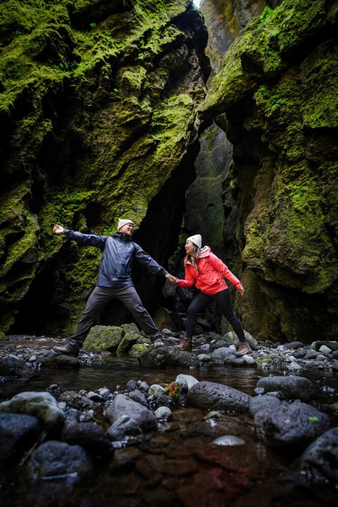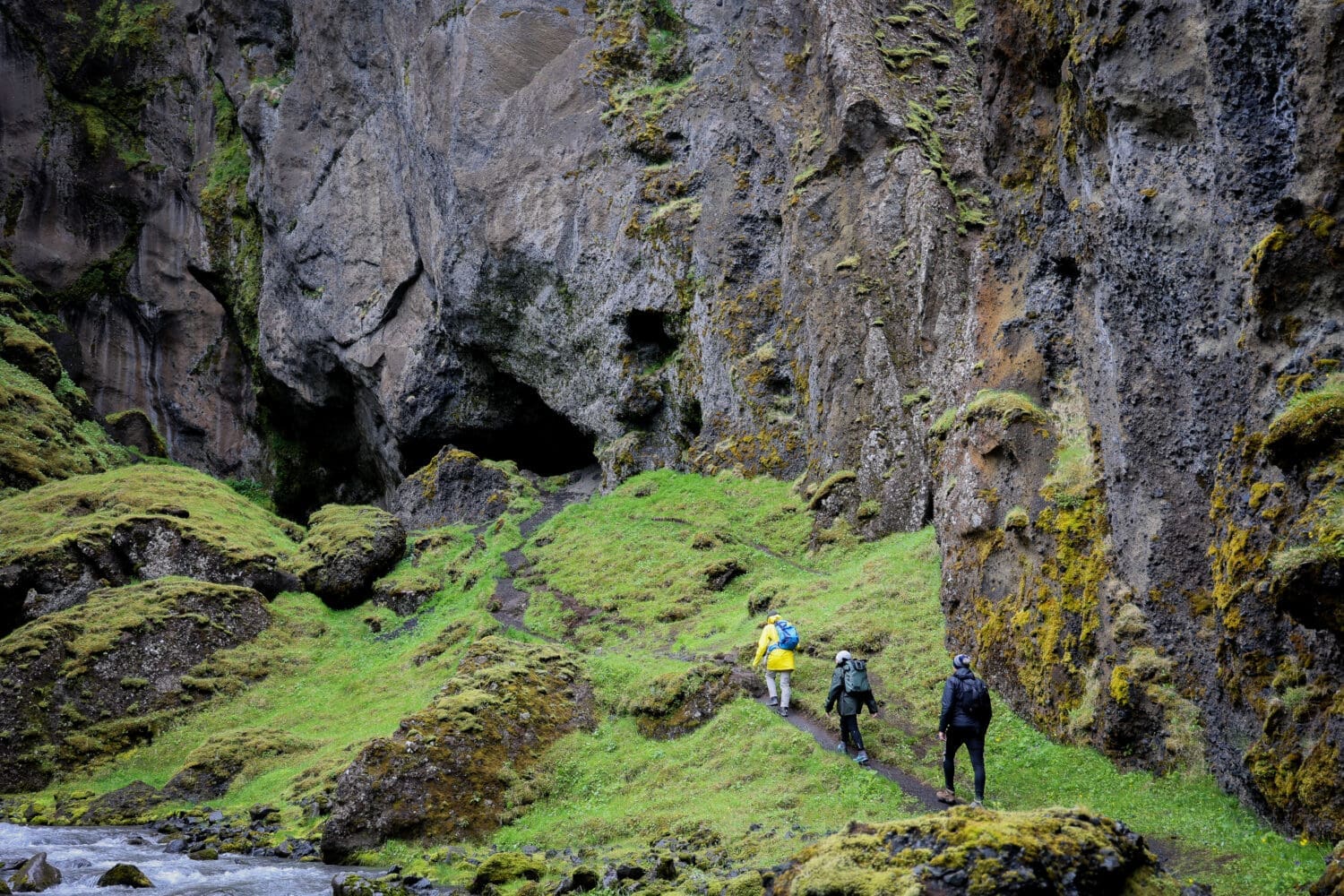 Hiking for about 2 kilometers (1.25 miles) into Stakkholtsgjá Canyon, we will reach a massive crack in the mountain which leads into a cave with a waterfall. This location is a true hidden gem within the valley and a perfect place for some great photos amongst the green canyon walls.
