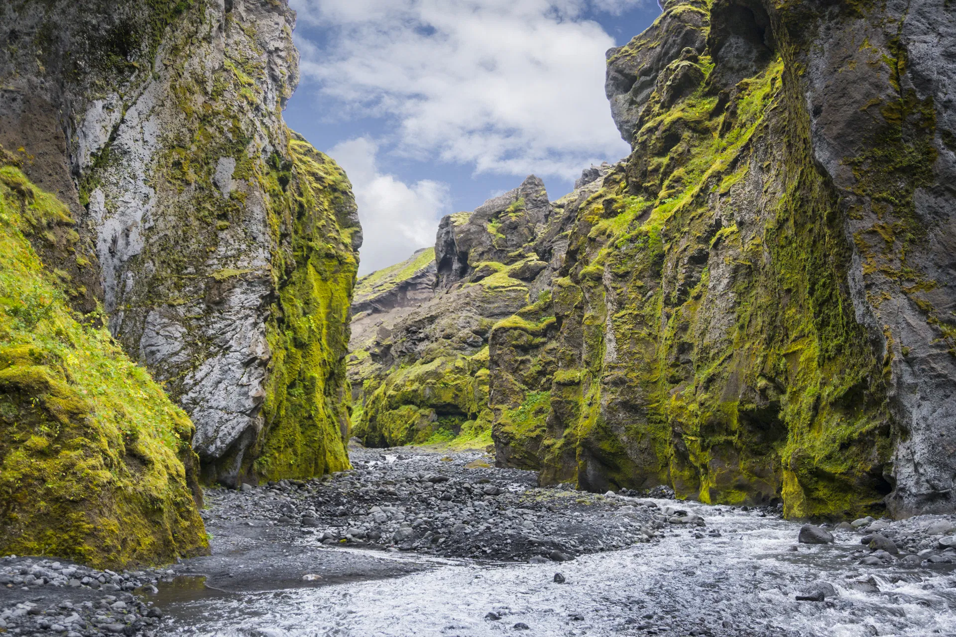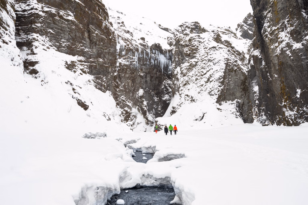 From here, we’ll explore Stakkholtsgjá Canyon, a breathtaking gorge surrounded by 100-meter-high mossy cliffs and caves. Known for its appearance in Game of Thrones, this canyon is also a rewarding short hike with a dreamy waterfall tucked into a cave at the end—a spot straight out of a fairy tale!