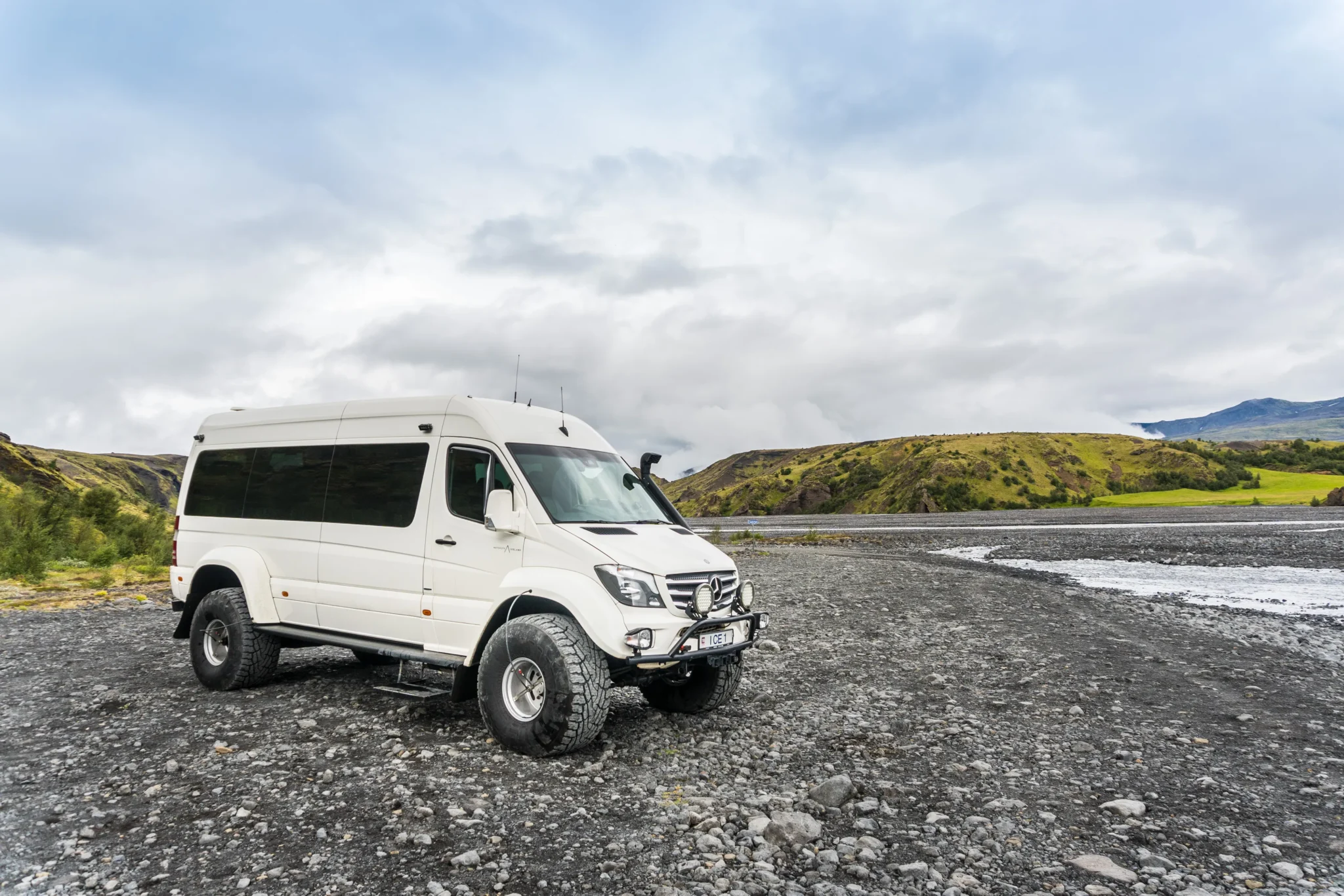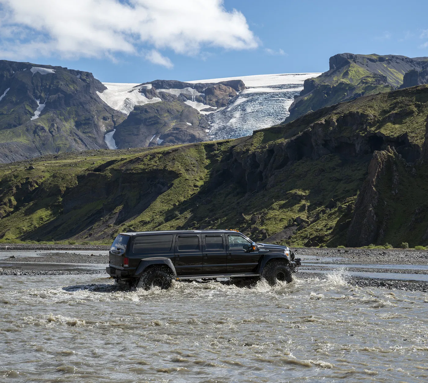 Our journey continues deep into Þórsmörk, a lush valley tucked between glaciers and famed for its rugged beauty. The Super Jeep comes alive here, navigating river crossings and rough terrain. Þórsmörk’s green oasis, lined with birch trees, contrasts beautifully against the black sands and glacial vistas. It’s a beloved spot for hiking and relaxation, where we’ll take a lunch break and enjoy short hikes to drink in the untouched beauty of the landscape.