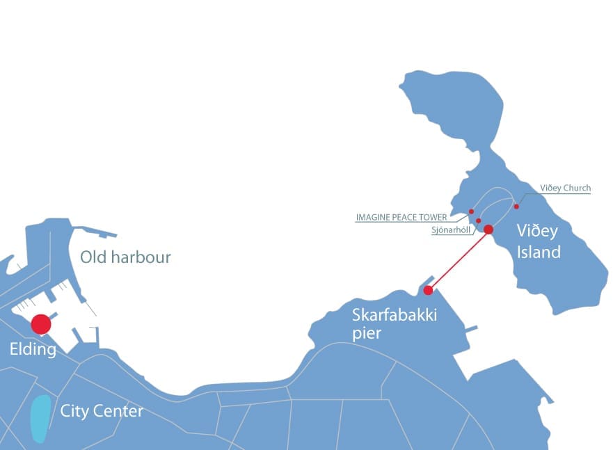 The island is home to the Imagine Peace Tower, designed by Yoko Ono as a tribute to her late husband John Lennon. The pillar of light symbolises their continuing campaign for world peace. Other noteworthy attention points are Viðey Church, Viðeyjarnaust Cabin, Viðeyjarstofa Café, the Old School House and the Water Reservoir.