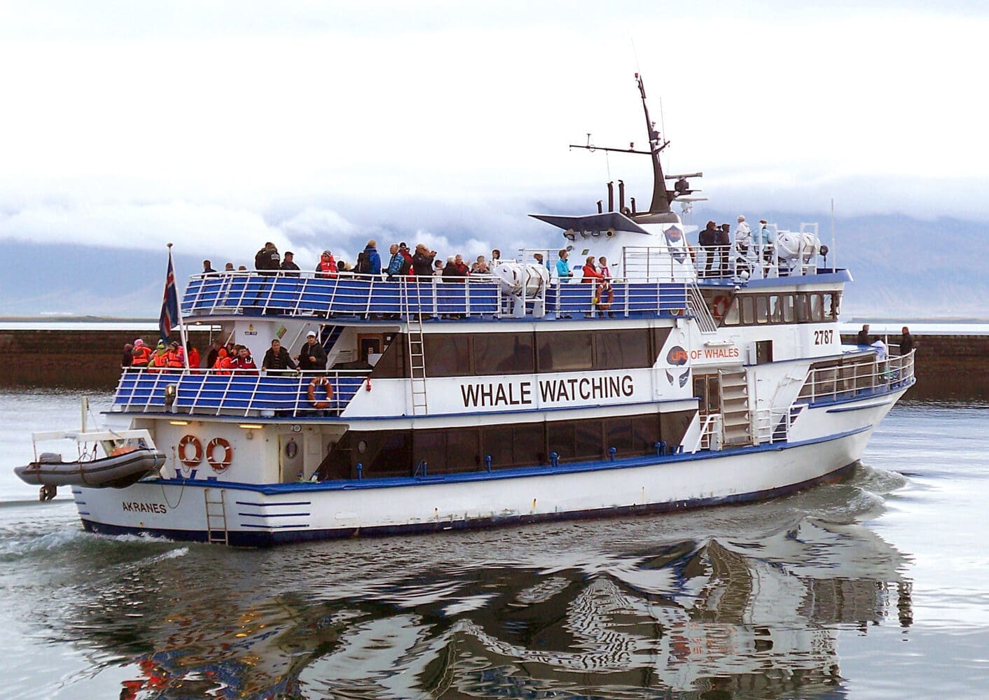 Both boats have spacious indoor and outdoor seating areas, a cafeteria on board, restrooms and thermal overalls (also available in children's sizes). The most common whale species in Faxaflói bay are minke whales, humpback whales, white-beaked dolphins and harbour porpoises.