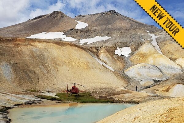 Guided helicopter tour which has a total time is about 2,5-3 hours with two landings, one near Glacier Lake Hvítárvatn and one at Hverabotnar in Kerlingarfjöll.